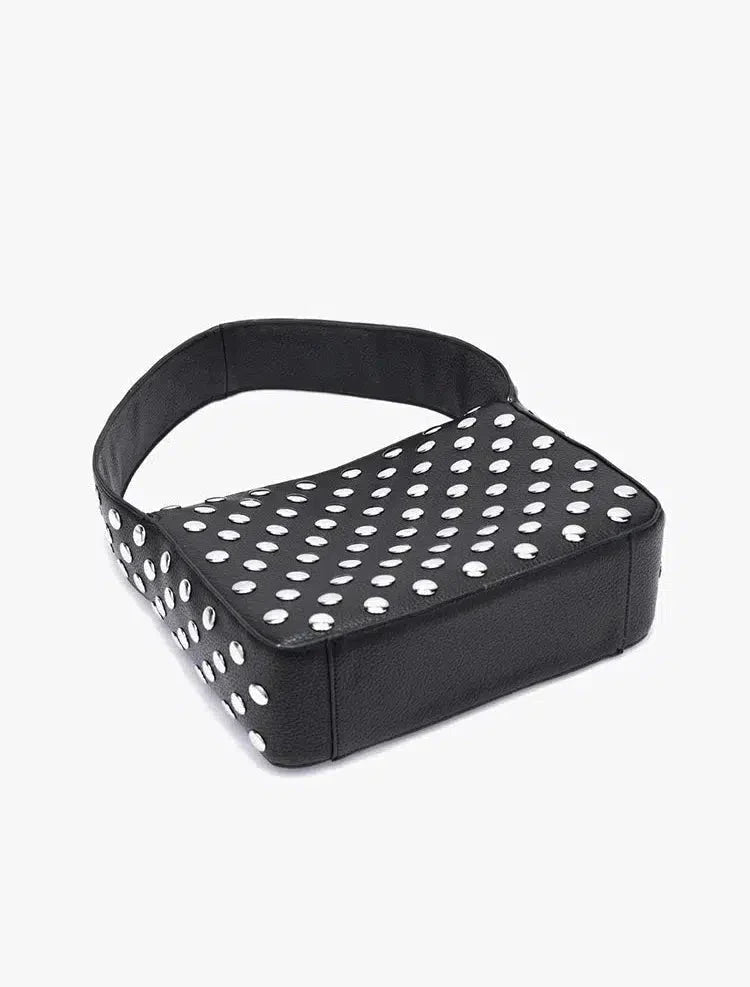 Elevate your look with the Delfina Luxe Studded Handbag, a bold statement piece that blends modern edge with everyday functionality. Crafted from high-quality black PU leather, this bag is adorned with striking silver-tone studs, creating a unique and stylish design that stands out.